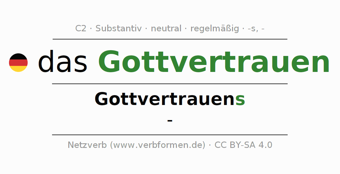 Die Deklination des Substantivs Gottvertrauen ist im Singular Genitiv Gottvertrauens und im Plural Nominativ -. Das Nomen Gottvertrauen wird stark mit den Deklinationsendungen s/- dekliniert. Es bildet keine Pluralformen. Das Genus bzw. grammatische Geschlecht von Gottvertrauen ist Neutral und der bestimmte Artikel ist "das". Man kann hier nicht nur Gottvertrauen deklinieren, sondern alle deutschen Substantive. Das Substantiv gehört zum Wortschatz des Zertifikats Deutsch bzw. zur Stufe C2. Kommentare ☆