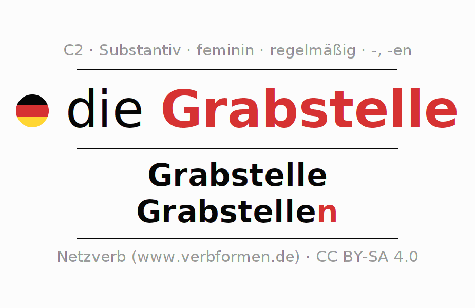 Die Deklination des Substantivs Grabstelle ist im Singular Genitiv Grabstelle und im Plural Nominativ Grabstellen. Das Nomen Grabstelle wird schwach mit den Deklinationsendungen -/n dekliniert. Das Genus bzw. grammatische Geschlecht von Grabstelle ist Feminin und der bestimmte Artikel ist "die". Man kann hier nicht nur Grabstelle deklinieren, sondern alle deutschen Substantive. Das Substantiv gehört zum Wortschatz des Zertifikats Deutsch bzw. zur Stufe C2. Kommentare ☆