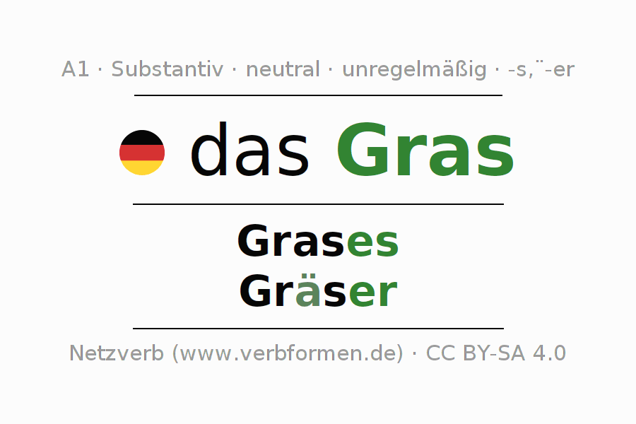 Die Deklination des Substantivs Gras ist im Singular Genitiv Grases und im Plural Nominativ Gräser. Das Nomen Gras wird stark mit den Deklinationsendungen es/ä-er dekliniert. Im Plural steht ein Umlaut. Das Genus bzw. grammatische Geschlecht von Gras ist Neutral und der bestimmte Artikel ist "das". Man kann hier nicht nur Gras deklinieren, sondern alle deutschen Substantive. Das Substantiv gehört zum Wortschatz des Zertifikats Deutsch bzw. zur Stufe A1. Kommentare ☆