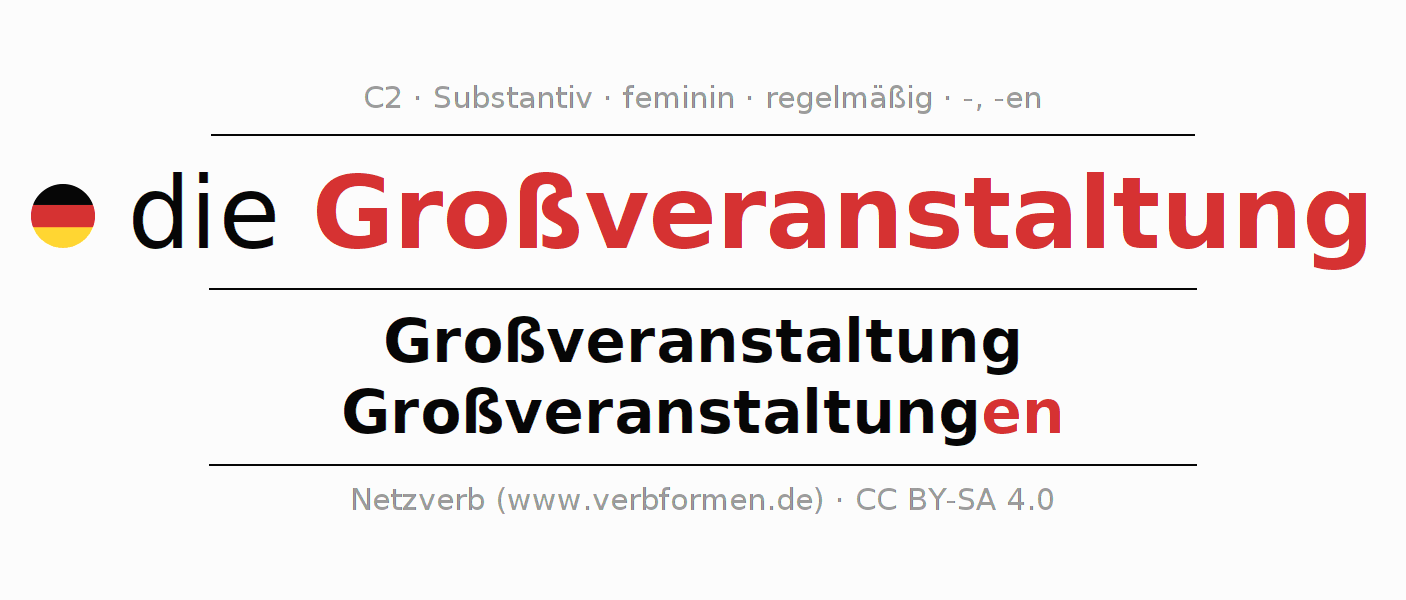 - Plural: die Großveranstaltungen, der Großveranstaltungen, den Großveranstaltungen, die Großveranstaltungen