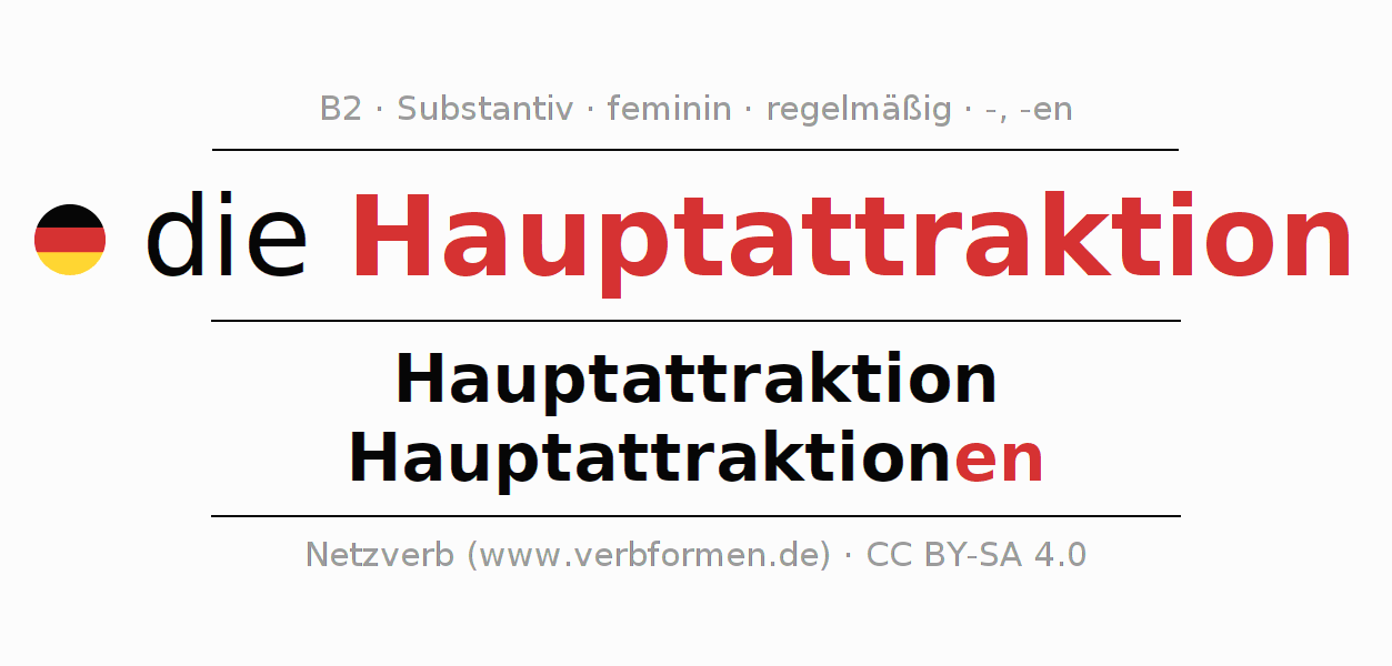 - Singular: die Hauptattraktion, der Hauptattraktion, der Hauptattraktion, die Hauptattraktion