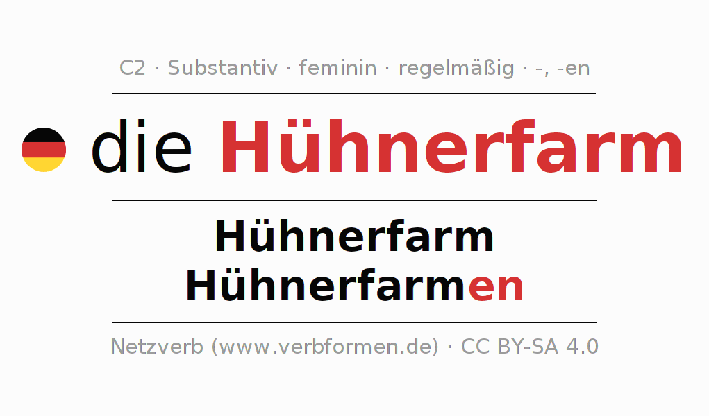 - Plural: die Hühnerfarmen, der Hühnerfarmen, den Hühnerfarmen, die Hühnerfarmen