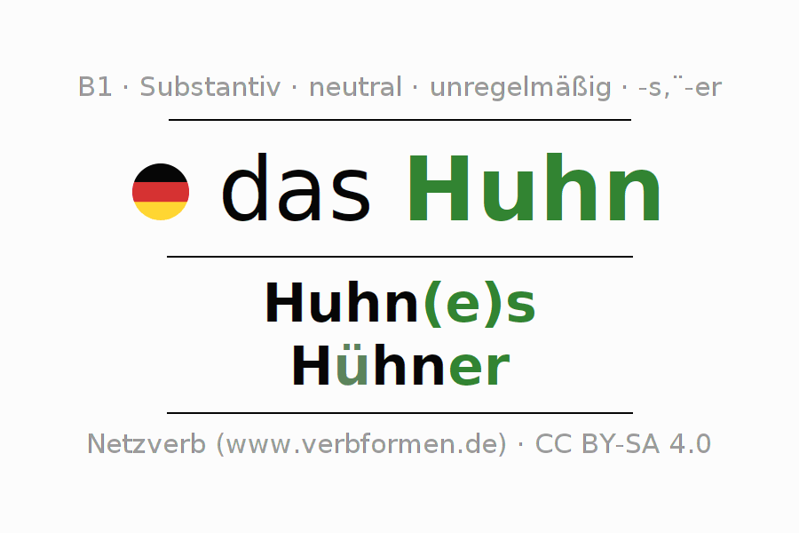 - Plural: die Hühner, der Hühner, den Hühnern, die Hühner