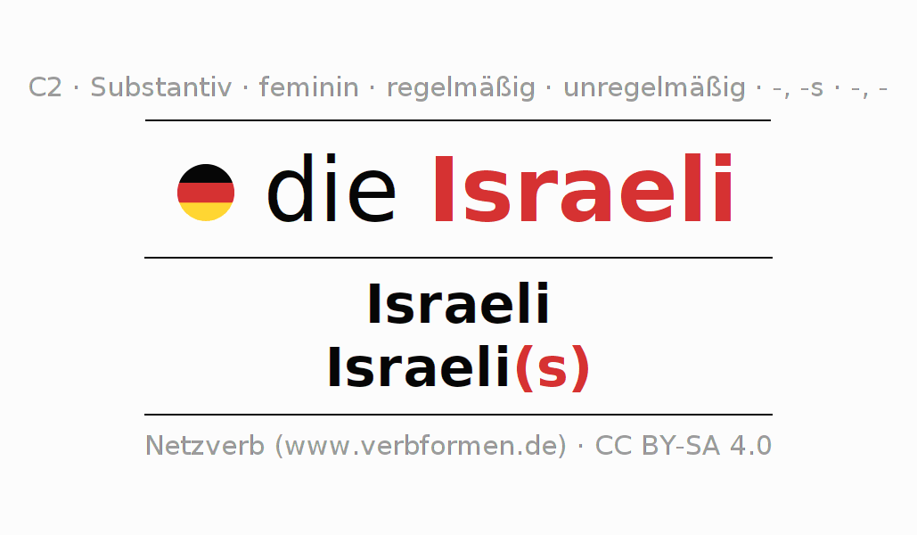 - Plural: die Israeli(s), der Israeli(s), den Israeli(s), die Israeli(s)