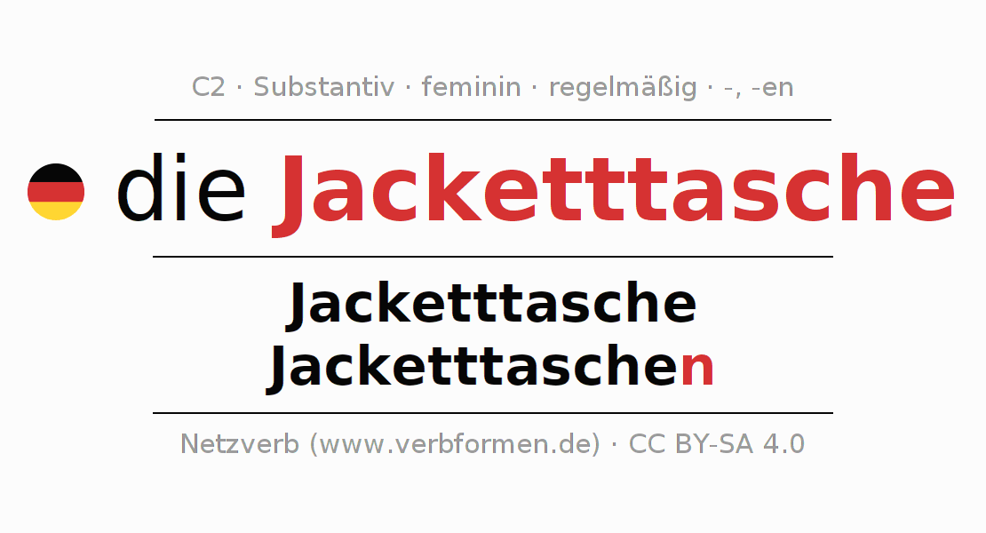 - Plural: die Jacketttaschen, der Jacketttaschen, den Jacketttaschen, die Jacketttaschen
