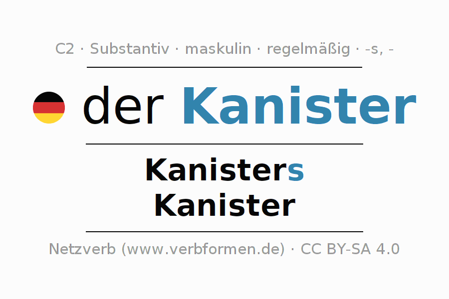 - Singular: der Kanister, des Kanisters, dem Kanister, den Kanister