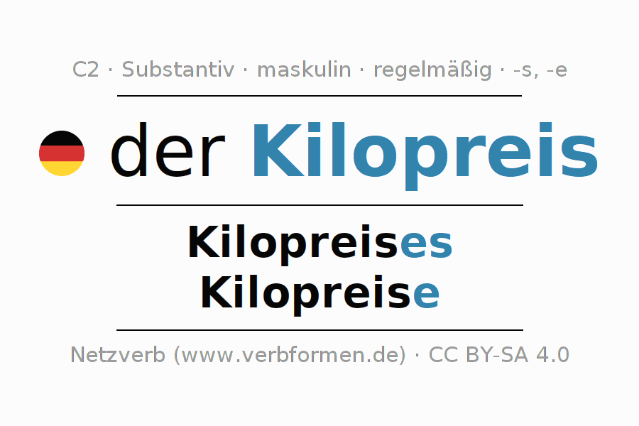 - Singular: der Kilopreis, des Kilopreises, dem Kilopreis(e), den Kilopreis