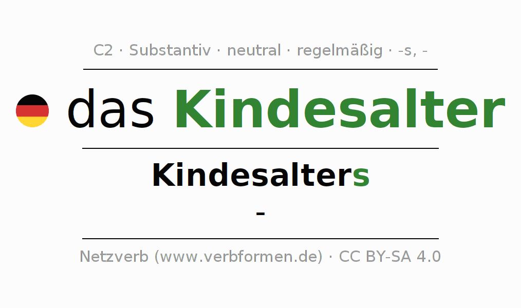 - Singular: das Kindesalter, des Kindesalters, dem Kindesalter, das Kindesalter