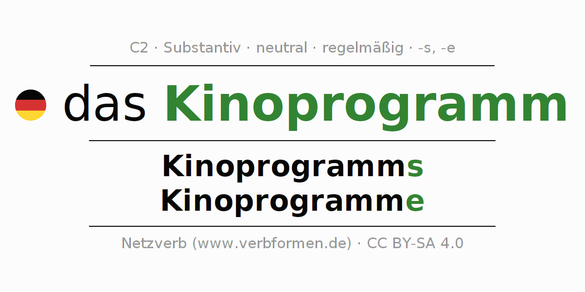 - Plural: die Kinoprogramme, der Kinoprogramme, den Kinoprogrammen, die Kinoprogramme