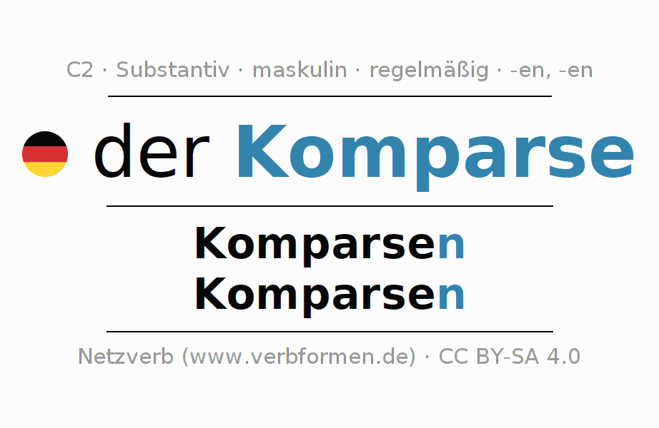 - Singular: der Komparse, des Komparsen, dem Komparsen, den Komparsen