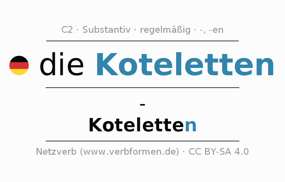 - Plural: die Koteletten, der Koteletten, den Koteletten, die Koteletten