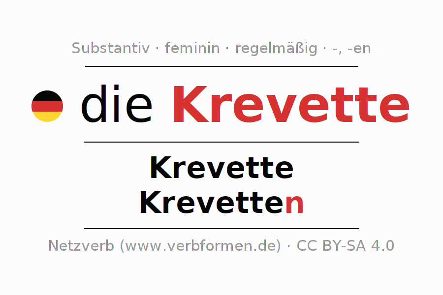 - Singular: die Krevette, der Krevette, der Krevette, die Krevette