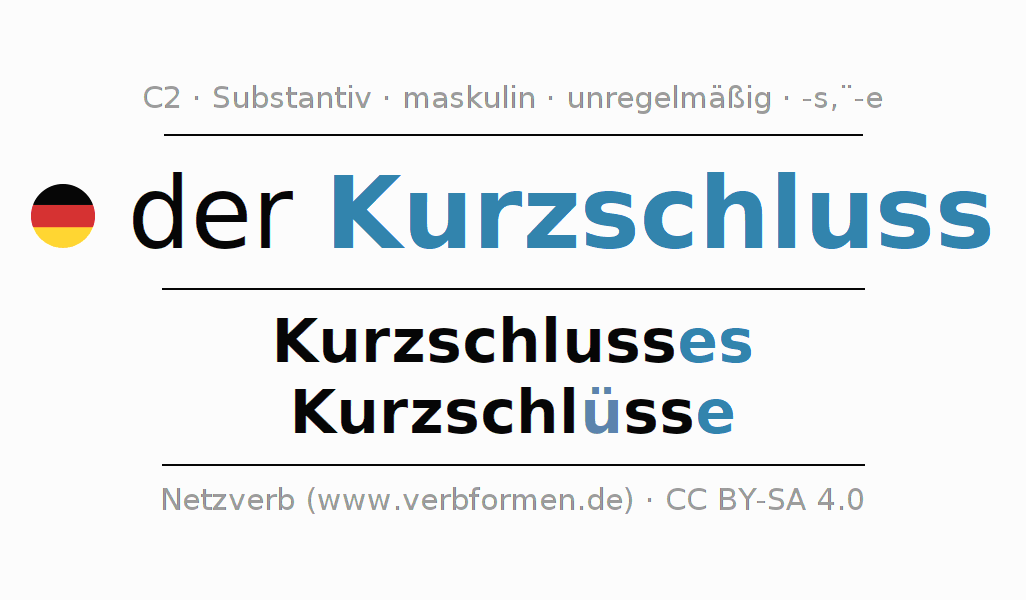 - Singular: der Kurzschluss, des Kurzschlusses, dem Kurzschluss(e), den Kurzschluss