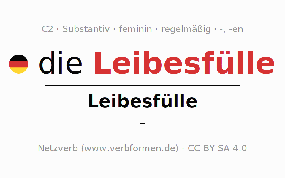 Die Deklination des Substantivs Leibesfülle ist im Singular Genitiv Leibesfülle und im Plural Nominativ -. Das Nomen Leibesfülle wird schwach mit den Deklinationsendungen -/- dekliniert. Es bildet keine Pluralformen. Das Genus bzw. grammatische Geschlecht von Leibesfülle ist Feminin und der bestimmte Artikel ist "die". Man kann hier nicht nur Leibesfülle deklinieren, sondern alle deutschen Substantive. Das Substantiv gehört zum Wortschatz des Zertifikats Deutsch bzw. zur Stufe C2. Kommentare ☆