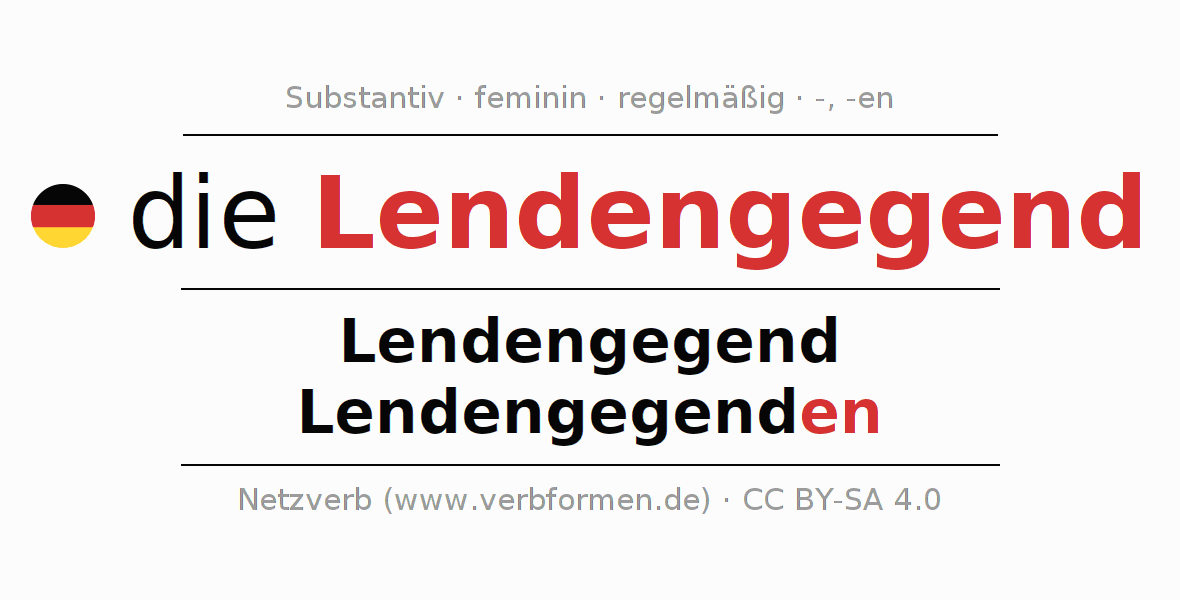 Die Deklination des Substantivs Lendengegend ist im Singular Genitiv Lendengegend und im Plural Nominativ Lendengegenden. Das Nomen Lendengegend wird schwach mit den Deklinationsendungen -/en dekliniert. Das Genus bzw. grammatische Geschlecht von Lendengegend ist Feminin und der bestimmte Artikel ist "die". Man kann hier nicht nur Lendengegend deklinieren, sondern alle deutschen Substantive. Kommentare ☆