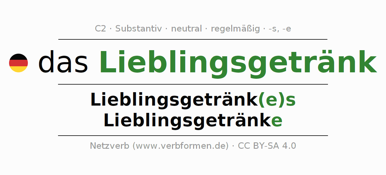 - Singular: das Lieblingsgetränk, des Lieblingsgetränk(e)s, dem Lieblingsgetränk(e), das Lieblingsgetränk