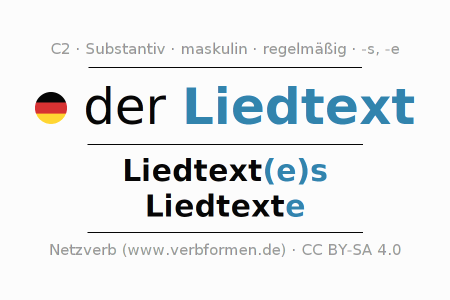 - Singular: der Liedtext, des Liedtext(e)s, dem Liedtext(e), den Liedtext