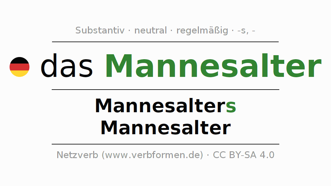 - Singular: das Mannesalter, des Mannesalters, dem Mannesalter, das Mannesalter