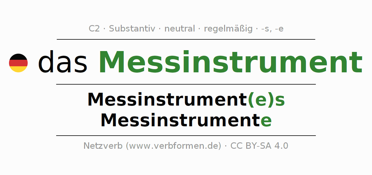 - Plural: die Messinstrumente, der Messinstrumente, den Messinstrumenten, die Messinstrumente