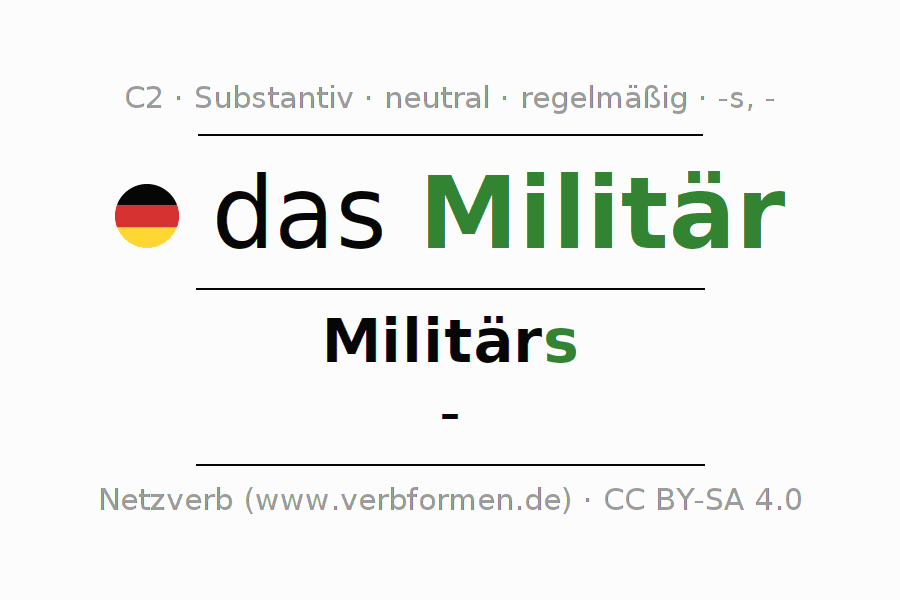 - Singular: das Militär, des Militärs, dem Militär, das Militär