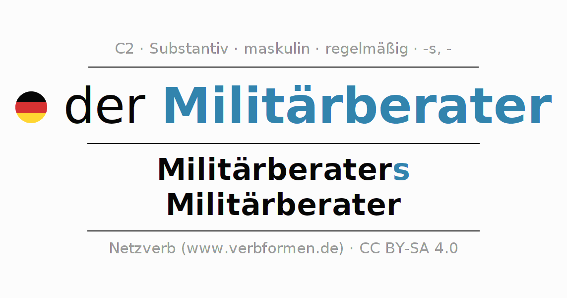 - Singular: der Militärberater, des Militärberaters, dem Militärberater, den Militärberater