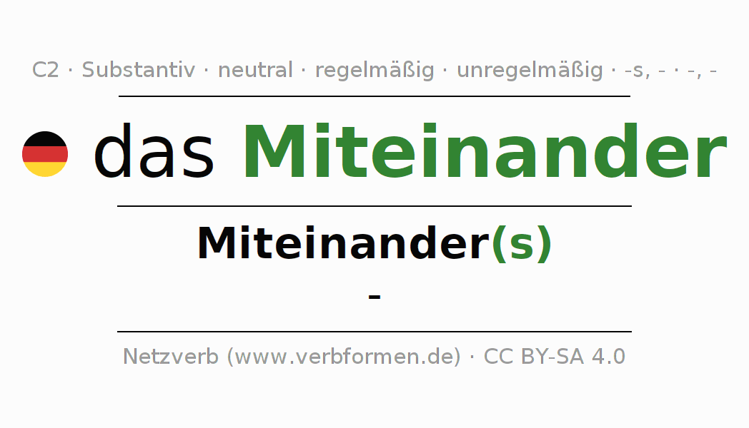 Die Deklination des Substantivs Miteinander ist im Singular Genitiv Miteinander(s) und im Plural Nominativ -. Das Nomen Miteinander wird stark mit den Deklinationsendungen s/-/- dekliniert. Es bildet keine Pluralformen. Das Genus bzw. grammatische Geschlecht von Miteinander ist Neutral und der bestimmte Artikel ist "das". Man kann hier nicht nur Miteinander deklinieren, sondern alle deutschen Substantive. Das Substantiv gehört zum Wortschatz des Zertifikats Deutsch bzw. zur Stufe C2. Kommentare ☆