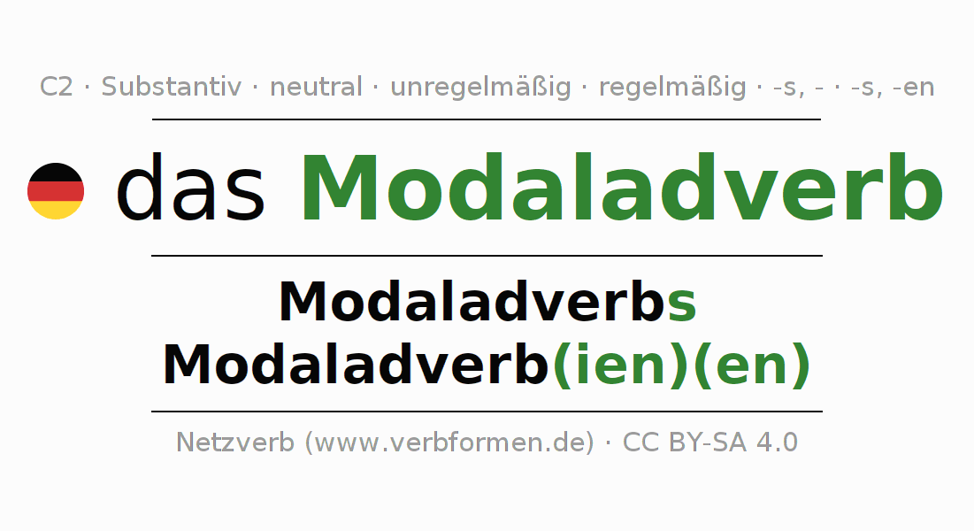 - Singular: das Modaladverb, des Modaladverbs, dem Modaladverb, das Modaladverb