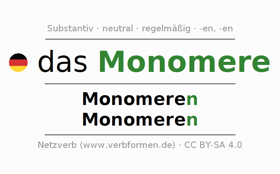 - Plural: die Monomeren, der Monomeren, den Monomeren, die Monomeren