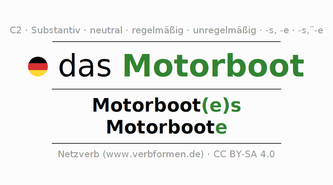 - Plural: die Motorboote, der Motorboote, den Motorbooten, die Motorboote