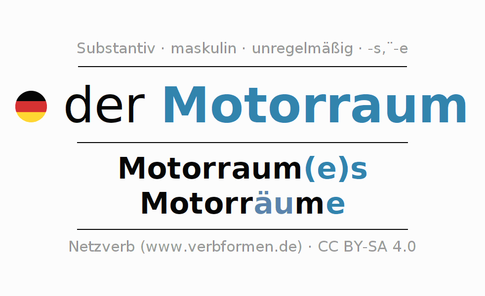 - Plural: die Motorräume, der Motorräume, den Motorräumen, die Motorräume