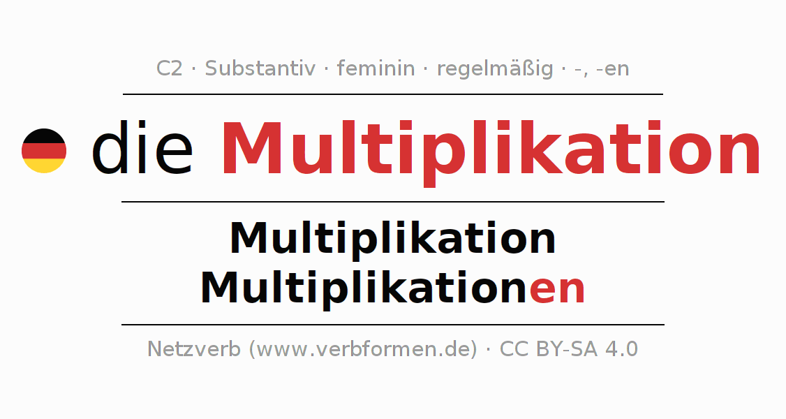 - Plural: die Multiplikationen, der Multiplikationen, den Multiplikationen, die Multiplikationen