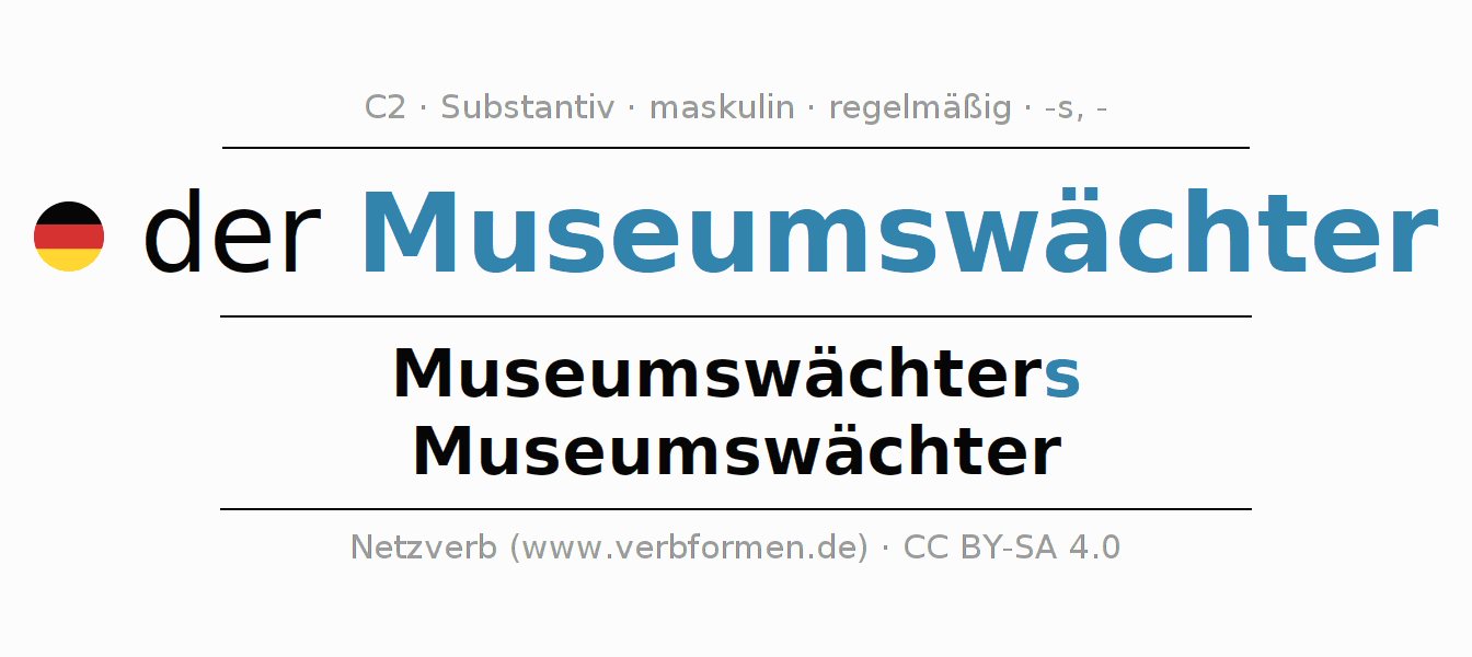 - Singular: der Museumswächter, des Museumswächters, dem Museumswächter, den Museumswächter