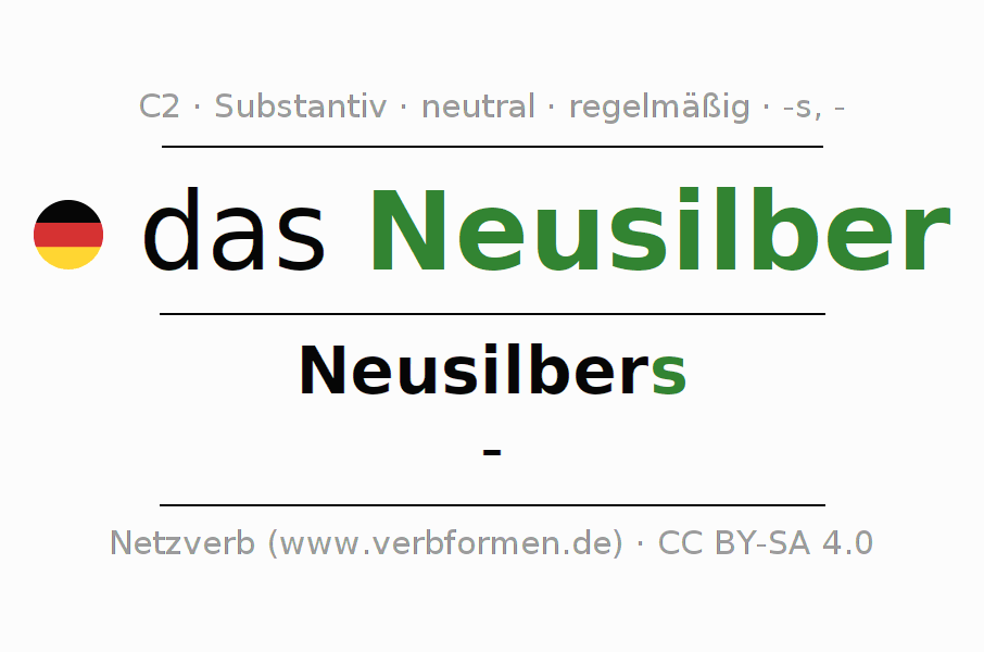 Die Deklination des Substantivs Neusilber ist im Singular Genitiv Neusilbers und im Plural Nominativ -. Das Nomen Neusilber wird stark mit den Deklinationsendungen s/- dekliniert. Es bildet keine Pluralformen. Das Genus bzw. grammatische Geschlecht von Neusilber ist Neutral und der bestimmte Artikel ist "das". Man kann hier nicht nur Neusilber deklinieren, sondern alle deutschen Substantive. Das Substantiv gehört zum Wortschatz des Zertifikats Deutsch bzw. zur Stufe C2. Kommentare ☆