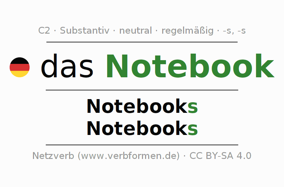 - Plural: die Notebooks, der Notebooks, den Notebooks, die Notebooks