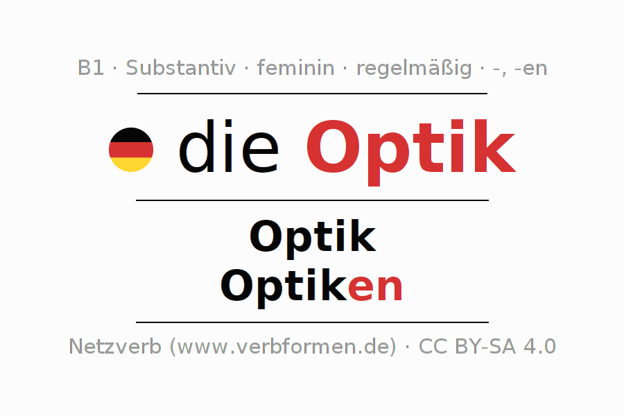 - Plural: die Optiken, der Optiken, den Optiken, die Optiken