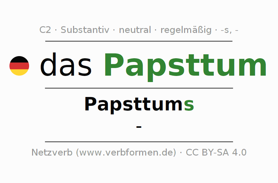 Die Deklination des Substantivs Papsttum ist im Singular Genitiv Papsttums und im Plural Nominativ -. Das Nomen Papsttum wird stark mit den Deklinationsendungen s/- dekliniert. Es bildet keine Pluralformen. Das Genus bzw. grammatische Geschlecht von Papsttum ist Neutral und der bestimmte Artikel ist "das". Man kann hier nicht nur Papsttum deklinieren, sondern alle deutschen Substantive. Das Substantiv gehört zum Wortschatz des Zertifikats Deutsch bzw. zur Stufe C2. Kommentare ☆