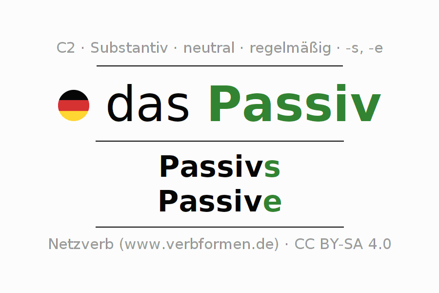 Die Deklination des Substantivs Passiv ist im Singular Genitiv Passivs und im Plural Nominativ Passive. Das Nomen Passiv wird stark mit den Deklinationsendungen s/e dekliniert. Das Genus bzw. grammatische Geschlecht von Passiv ist Neutral und der bestimmte Artikel ist "das". Man kann hier nicht nur Passiv deklinieren, sondern alle deutschen Substantive. Das Substantiv gehört zum Wortschatz des Zertifikats Deutsch bzw. zur Stufe C2. Kommentare ☆