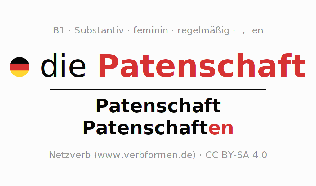 - Singular: die Patenschaft, der Patenschaft, der Patenschaft, die Patenschaft