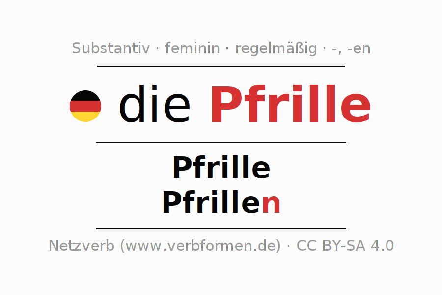 Die Deklination des Substantivs Pfrille ist im Singular Genitiv Pfrille und im Plural Nominativ Pfrillen. Das Nomen Pfrille wird schwach mit den Deklinationsendungen -/n dekliniert. Das Genus bzw. grammatische Geschlecht von Pfrille ist Feminin und der bestimmte Artikel ist "die". Man kann hier nicht nur Pfrille deklinieren, sondern alle deutschen Substantive. Kommentare ☆