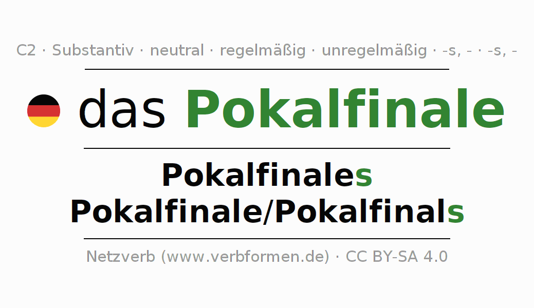 - Singular: das Pokalfinale, des Pokalfinales, dem Pokalfinale, das Pokalfinale