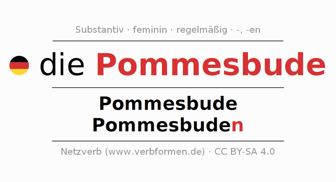 Die Deklination des Substantivs Pommesbude ist im Singular Genitiv Pommesbude und im Plural Nominativ Pommesbuden. Das Nomen Pommesbude wird schwach mit den Deklinationsendungen -/n dekliniert. Das Genus bzw. grammatische Geschlecht von Pommesbude ist Feminin und der bestimmte Artikel ist "die". Man kann hier nicht nur Pommesbude deklinieren, sondern alle deutschen Substantive. Kommentare ☆