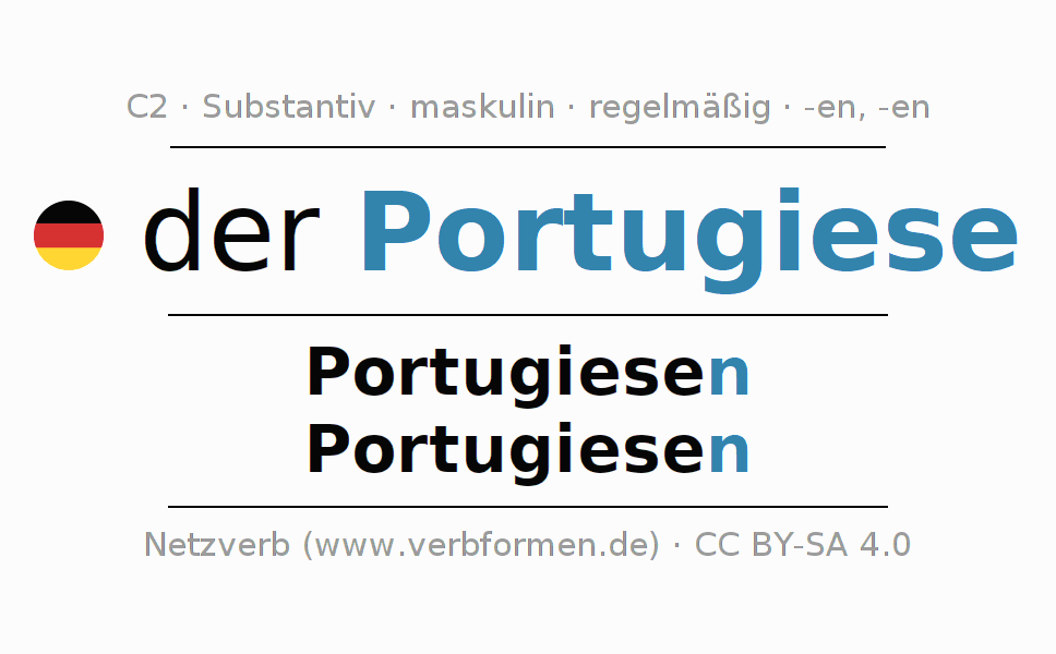 - Plural: die Portugiesen, der Portugiesen, den Portugiesen, die Portugiesen
