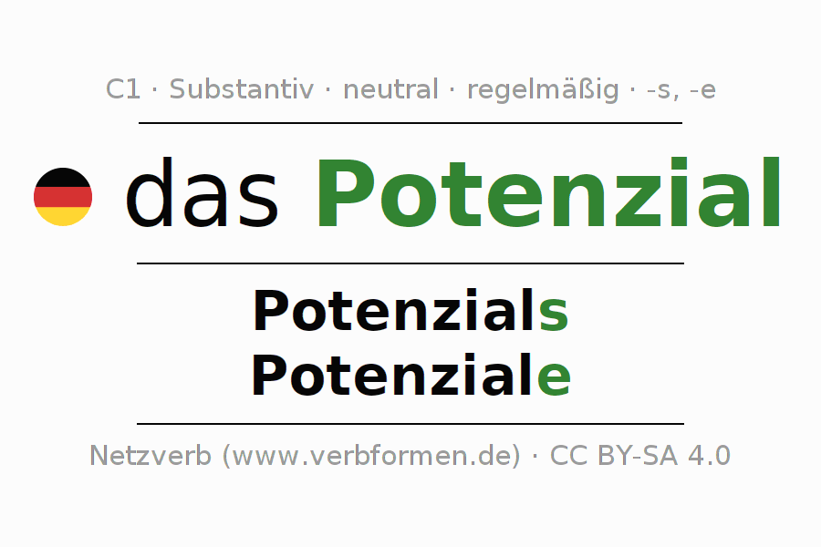 - Plural: die Potenziale, der Potenziale, den Potenzialen, die Potenziale