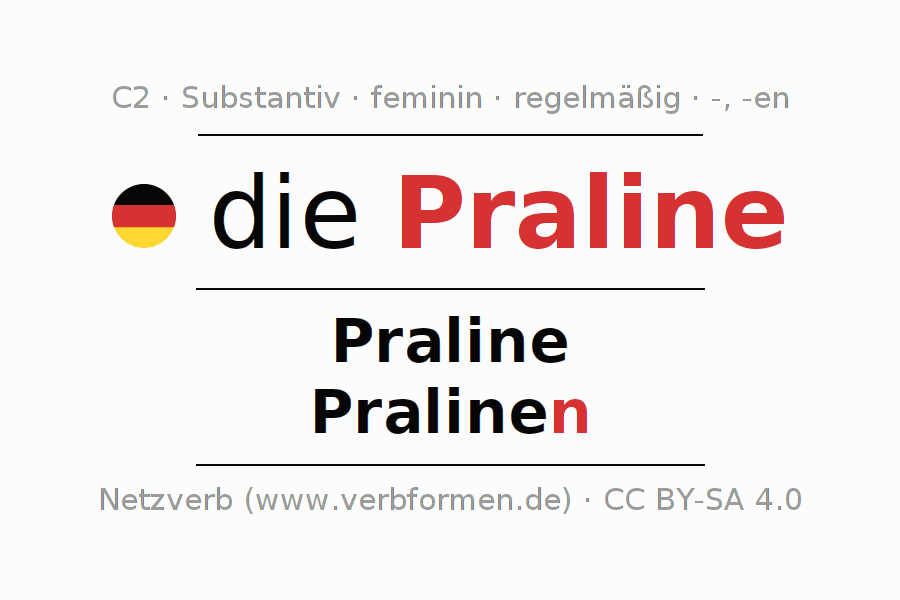 - Plural: die Pralinen, der Pralinen, den Pralinen, die Pralinen