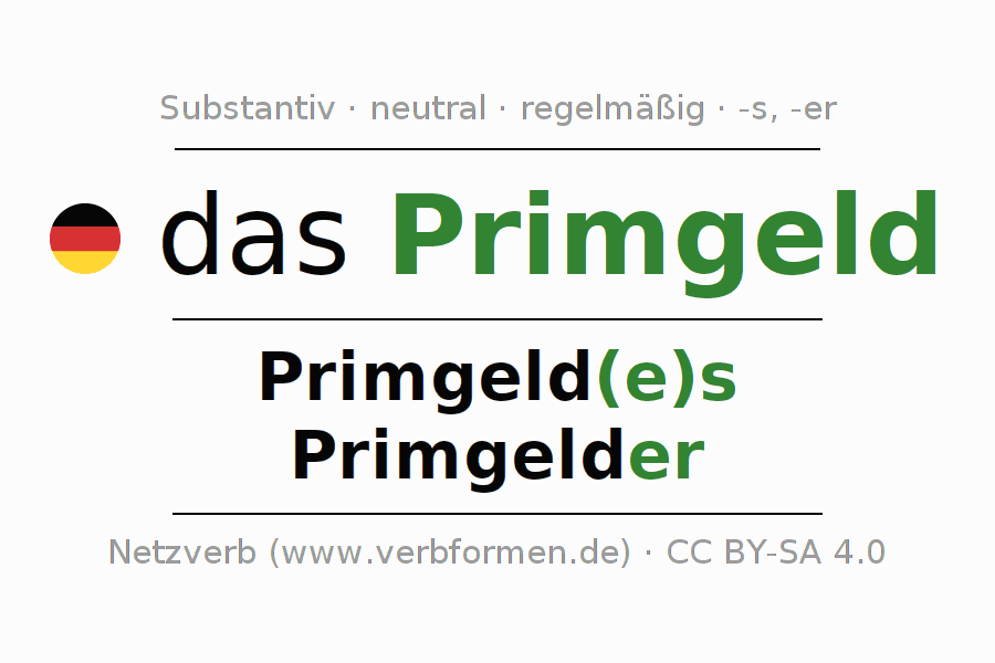 Die Deklination des Substantivs Primgeld ist im Singular Genitiv Primgeld(e)s und im Plural Nominativ Primgelder. Das Nomen Primgeld wird stark mit den Deklinationsendungen es/er dekliniert. Das Genus bzw. grammatische Geschlecht von Primgeld ist Neutral und der bestimmte Artikel ist "das". Man kann hier nicht nur Primgeld deklinieren, sondern alle deutschen Substantive. Kommentare ☆