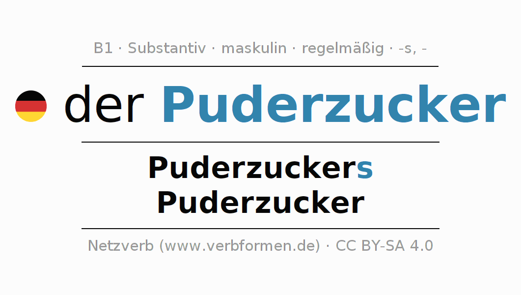 - Singular: der Puderzucker, des Puderzuckers, dem Puderzucker, den Puderzucker