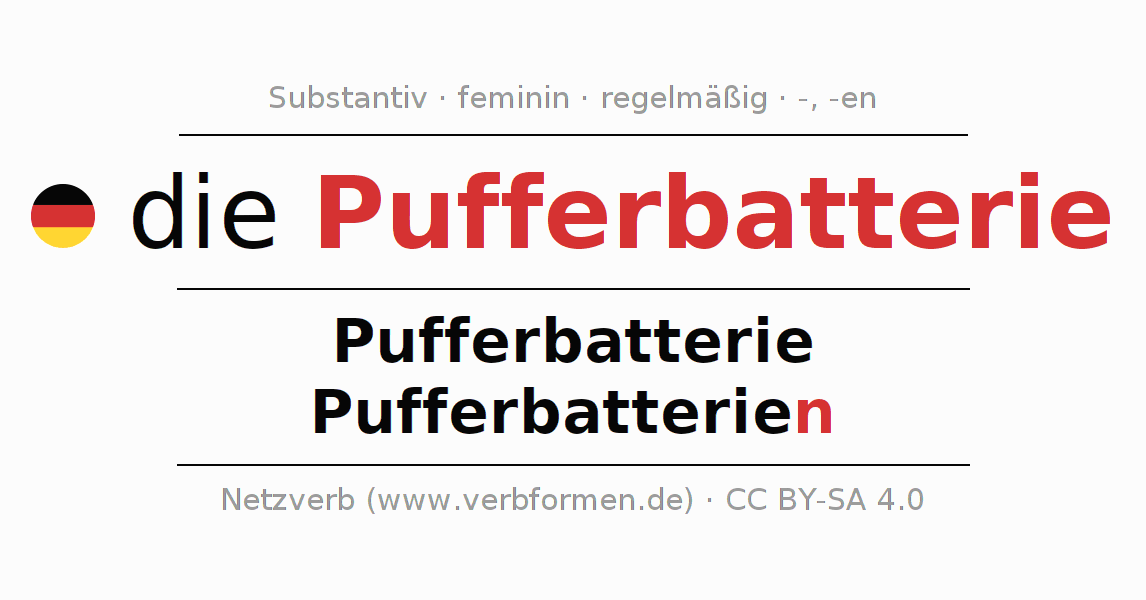 - Singular: die Pufferbatterie, der Pufferbatterie, der Pufferbatterie, die Pufferbatterie