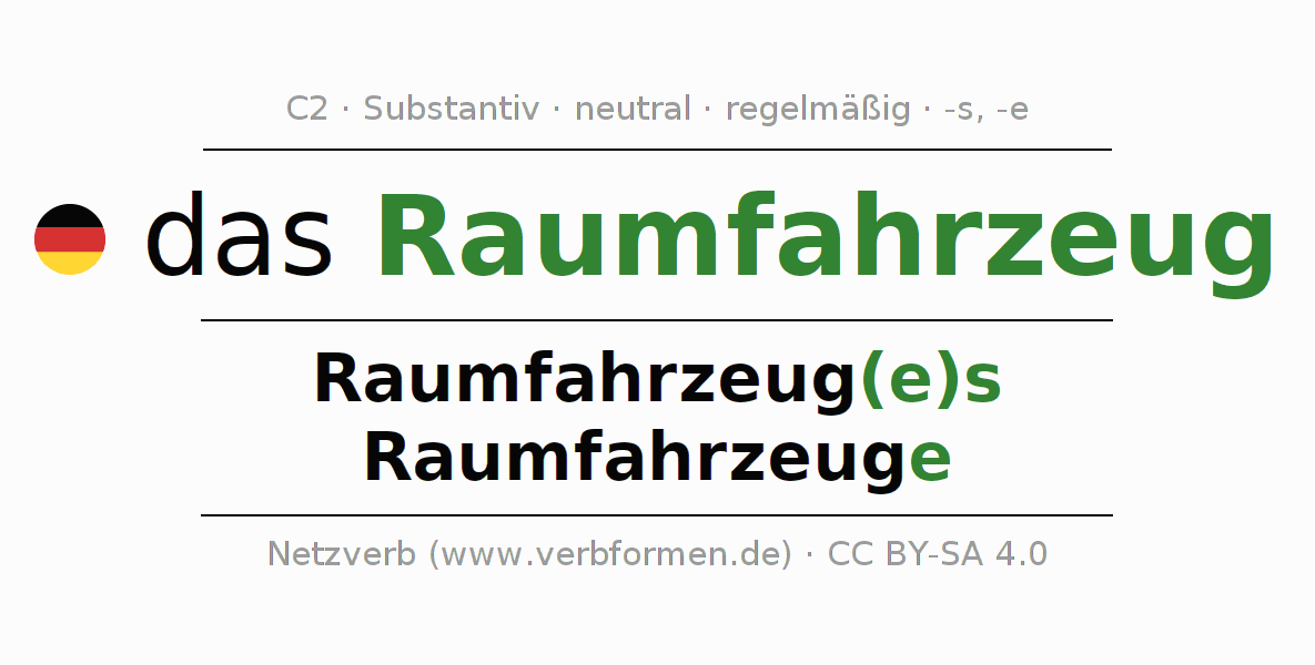 - Singular: das Raumfahrzeug, des Raumfahrzeug(e)s, dem Raumfahrzeug(e), das Raumfahrzeug