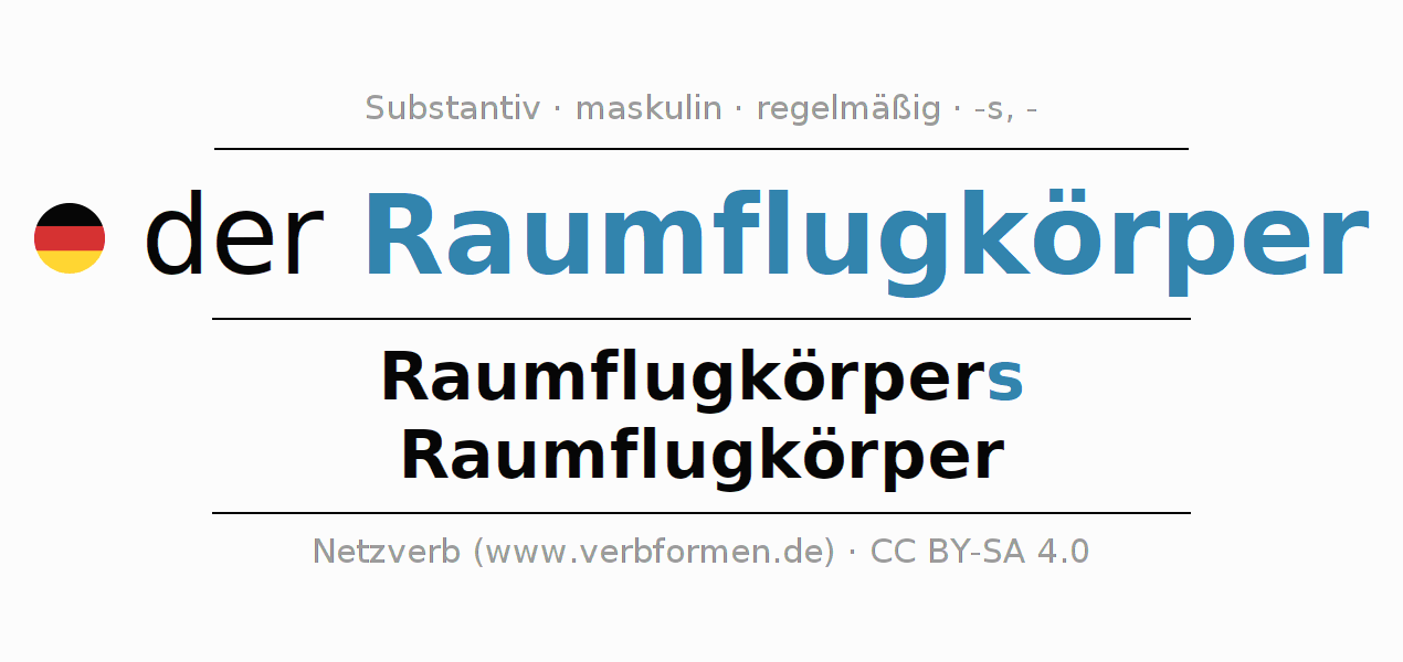 - Singular: der Raumflugkörper, des Raumflugkörpers, dem Raumflugkörper, den Raumflugkörper