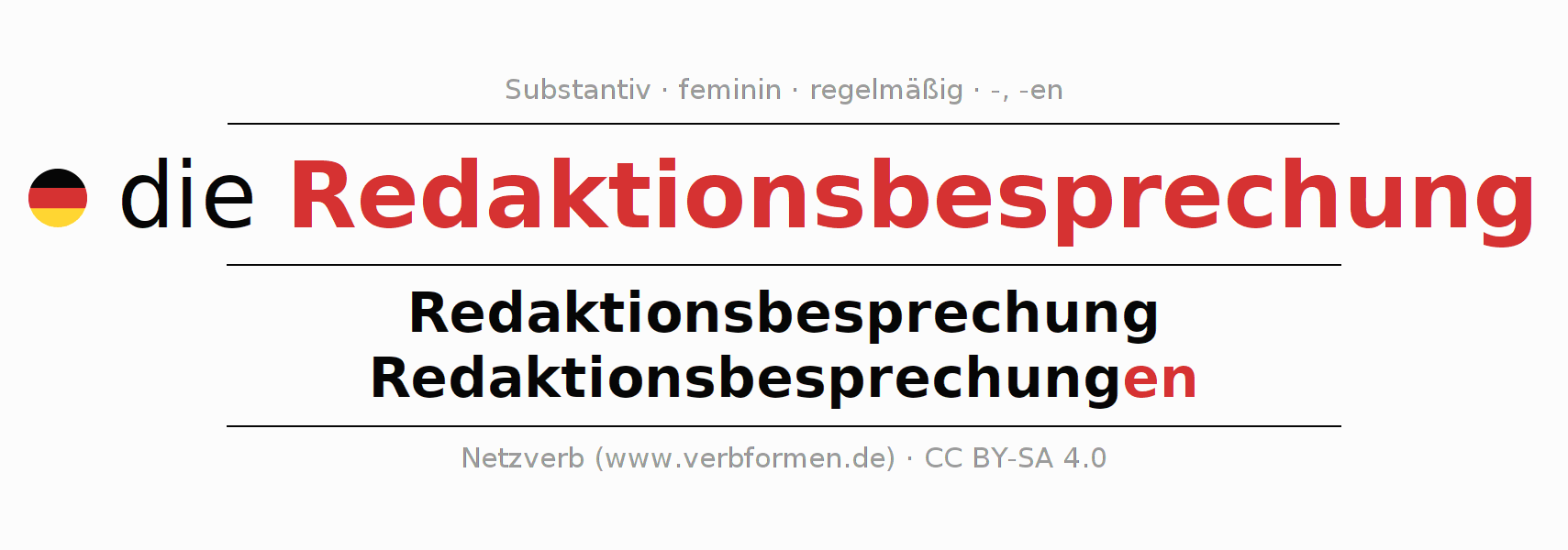 - Singular: die Redaktionsbesprechung, der Redaktionsbesprechung, der Redaktionsbesprechung, die Redaktionsbesprechung